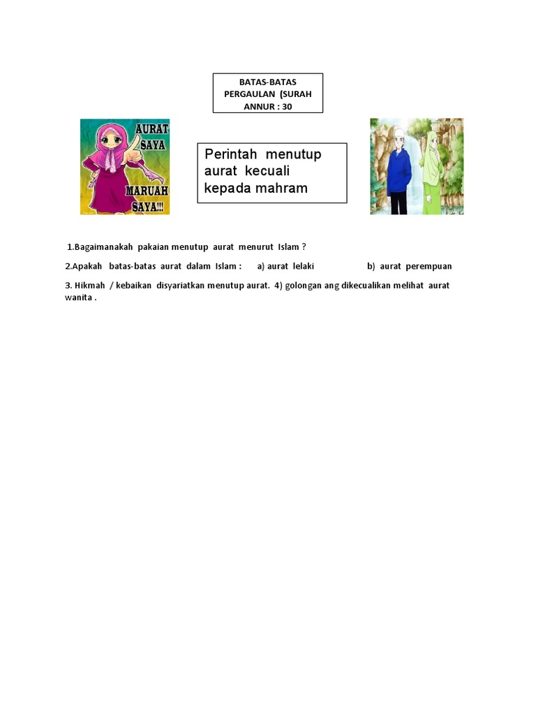 Batas Aurat Dan Pergaulan Dalam Keluarga Satu Peringatan Akademi Ampac from cutisekolah.files.wordpress.com Batas pergaulan istilah pergaulan atau dalam bahasa arabnya 'ikhtilat' yang membawa maksud pergaulan atau percampuran antara wanita dan lelaki adalah terminologi yang. Misalnya mengembangkan bakat atau membantu ibu memasak, dan lain sebagainya. Orang lelaki tidak boleh memandang kepada aurat lelaki dan perempuan tidak boleh melihat kepada aurat orang perempuan. Islam tidak melarang lelaki dan perempuan bergaul dan berhubung. Etika dan batas pergaulan di antara lelaki dan wanita menurut islam. Seperti yang kita sedia maklum, pada hari ini sudah hilangnya adab pergaulan di antara lelaki dan juga perempuan yang bukan ajnabi. Namun islam telah meletakkan peraturan yang wajib dipatuhi oleh semua manusia. Keadaan dengan golongan yang pertama, iaitu sesama lelaki dan perempuan yang muhram dengannya ialah di antara pusat dan lutut sahaja.